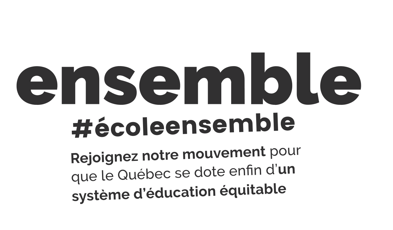 Fondé par des parents d’élèves en juin 2017, École ensemble anime un espace de réflexion et de mobilisation afin que le Québec se dote d’un système d’éducation équitable en mettant fin à la ségrégation scolaire causée par les réseaux privé subventionné et public sélectif.